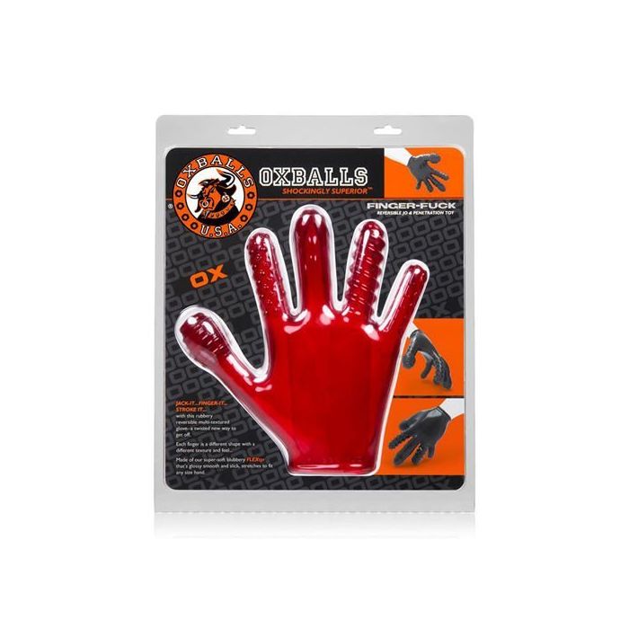 Finger Fuck is een zachte rubberen handschoen ontworpen om enkel met je vingers je partner een heerlijke uniek anale ervaring te geven. Elke vinger heeft een andere genopte structuur en zal dus een ander gevoel in de anus teweeg brengen. De ene vinger heeft stimulerende noppen terwijl de andere vinger weer heerlijke ribbels vertonen. Jij kan zelf kiezen waar jij je partner mee gaat verwennen. Op de duim is een grote ronde bol bevestigd die jij heel goed kan gebruiken om je partner een lekkere prostaat massage mee te geven, de middelvinger heeft de vorm van een penis geheel met aders en eikel om het af te maken. De handschoen is gemaakt van zeer rekbaar materiaal zodat hij om vrijwel elke hand zal passen. Om het aantrekken te vergemakkelijken breng een kleine hoeveelheid glijmiddel aan op de gehele hand en laat je hand zo in de handschoen glijden. Nu kan jij beginnen met het verwennen van je lover op wel 5 verschillende manieren.