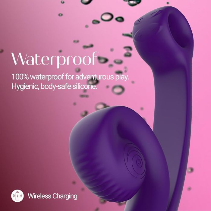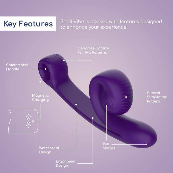 Ontdek de Snail Vibe Curve, een ergonomisch gevormde vibrator die speciaal is ontworpen voor G-spot-stimulatie en voorzien is van een getextureerde clitoriskop en een comfortabel handvat. Deze innovatieve vibrator maakt gebruik van de Slide'n'Roll-technologie, waardoor clitorale en vaginale orgasmes synchroon kunnen worden ervaren voor ongeëvenaard genot. Met krachtige motoren en aparte bedieningselementen biedt deze lichaamsveilige vibrator gemaakt van ultrazachte siliconen 100% tevredenheid. De Snail Vibe Curve is uitgerust met magnetisch draadloos opladen en heeft een waterdicht ontwerp, waardoor het de perfecte metgezel is voor zowel solo- als partnerspel.