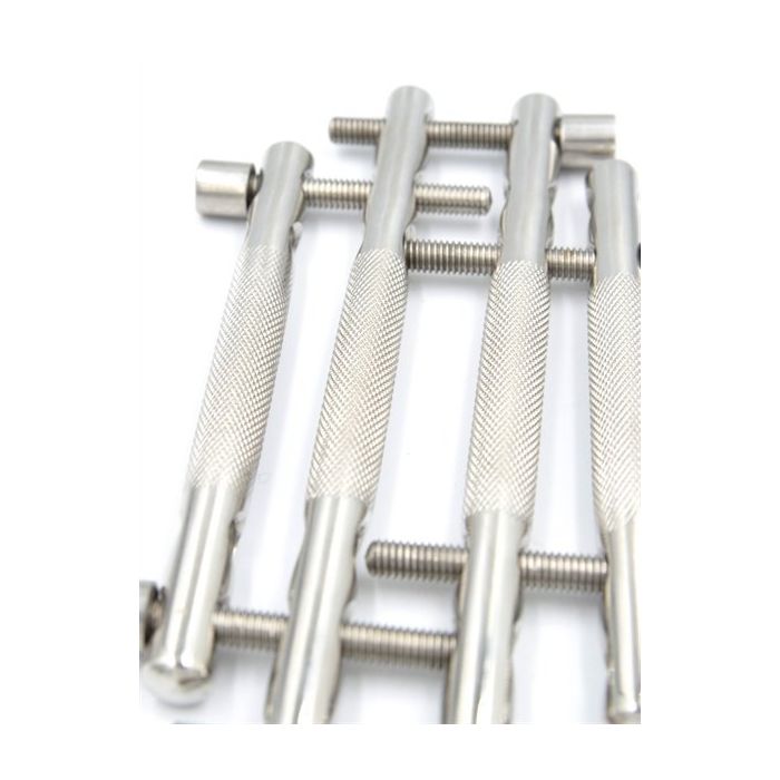 Wil jij je sub laten zwijgen? Met de Gag Total Silence weet je zeker dat je sub zal zwijgen want deze gag is zelfs beter dan een muilkorf. Knijp de lippen en tong in de drie afzonderlijke klemmen in één en ze kunnen die mond niet meer bewegen. De vier staven zijn zo gemaakt om op drie manieren te knijpen. Zo pas jij de druk aan die je nodig hebt. Daarna geniet lekker van de stilte.