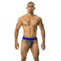 De lage tailleband heeft een royaal blauwe kleur. De blauwe elastische stof is afgewerkt met glanzend blauw garen waarmee het GIGO logo is geborduurd.