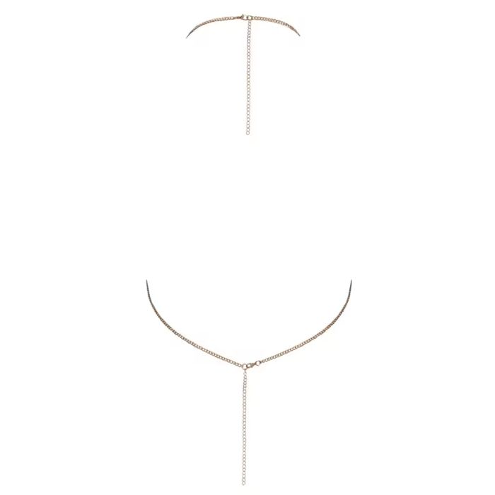 Deze glamoureuze kettingtop is versierd met sprankelende strassteentjes die elke beweging accentueren en je een onweerstaanbare uitstraling geven. De individueel verstelbare karabijnsluiting in de nek zorgt voor een perfecte pasvorm, terwijl de volledig open rug een gedurfde en sensuele touch toevoegt. Draag het naast je huid voor een stijlvol erotische look die zeker de aandacht zal trekken.
