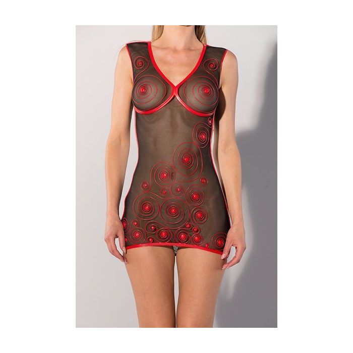 Het GP Printed Datex Jurkje - Rood is een combinatie van natuurlijk rubber en elastisch tule. Het jurkje zit nauwsluitend rond jouw vrouwelijke vormen. Het transparante tule laat niets aan de fantasie over. Het zwarte tule is afgewerkt met rode randen van latex en rode latex krullen. De latex krullen maken een speels patroon en accentueren de borsten.