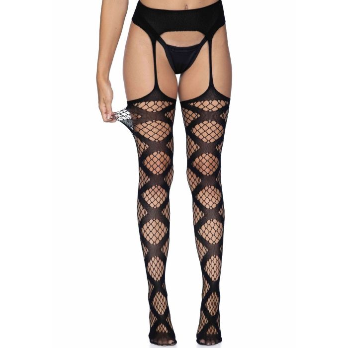 Deze grove visnet kousen met spannende details en aangehechte jarretelgordel zorgen voor de meest sexy look om je lover te verleiden. De kousen zijn gemaakt van stevig en zacht nylon waardoor het een hoog draagcomfort heeft. De kousen zijn gemakkelijk te combineren met een sexy lingerie setje of little black dress. Maak de look af met een paar high heels en je partner zal je niet weerstaan kunnen...