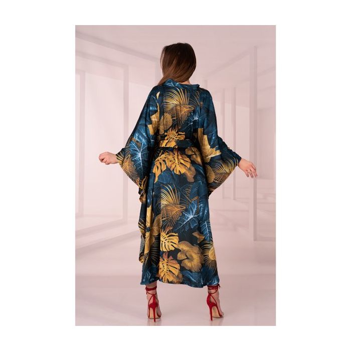 De kaftan heeft een brede boord en een bijgeleverde strik ceintuur. De voorkant is halflang en de afgeronde achterkant loopt langer door dan de voorkant voor een sierlijk effect.