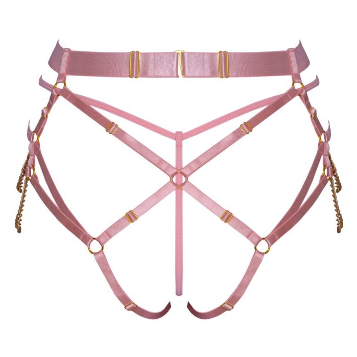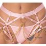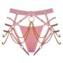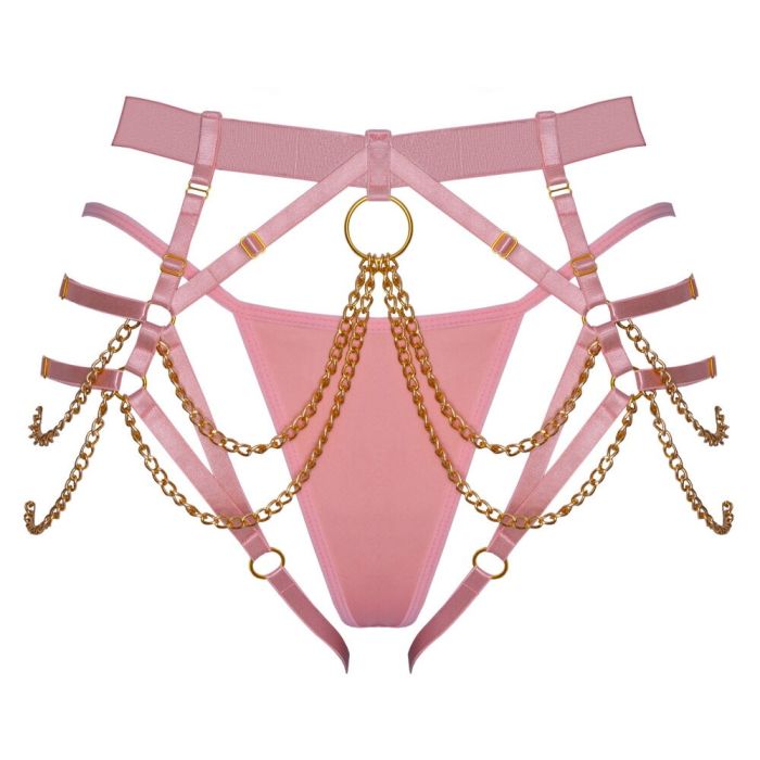 Deze unieke harnasstring is ontworpen om je zelfvertrouwen een boost te geven en je vrouwelijke vormen prachtig te accentueren. Gemaakt van rosékleurige, elegant glinsterende stretchbandjes, wordt deze harnasstring verfraaid met luxe goudkleurige accessoires die een glamoureuze uitstraling bieden. De swingende kettingen aan de voor- en zijkanten voegen een speelse flair toe, terwijl de zachte, elastische bandjes en de bredere tailleband meervoudig verstelbaar zijn voor een perfecte pasvorm die je de hele avond comfortabel laat voelen. Voor een minder onthullende look wordt er ook een schattige rozekleurige minitong meegeleverd, zodat je kunt variëren in stijl en zelfvertrouwen. Maak je lingeriecollectie compleet met deze onweerstaanbare harnasstring en laat je innerlijke diva stralen!