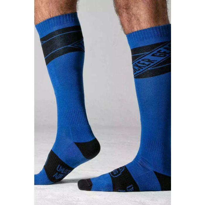 Ga voor een fantastische sportieve look en ontdek de perfecte accessoire om je outfit stijvol af te maken! Je kunt deze sokken dragen bij je favoriete Locker Gear jockstrap, singlet, slip of andere uitrusting. De sokken zijn voorzien van strepen, gekleurde patches en Locker Gear-branding. Doordat de sokken op kniehoogte zijn creëer je een sexy uitstraling. Daarnaast zijn de sokken gemaakt van een mix van katoen en nylon. Hierdoor zijn de sokken dik en super comfortabel. Verder zijn de hiel en teen gedempt en hebben ze voetboogondersteuning waardoor de sokken slijtvast zijn en heerlijk zitten!