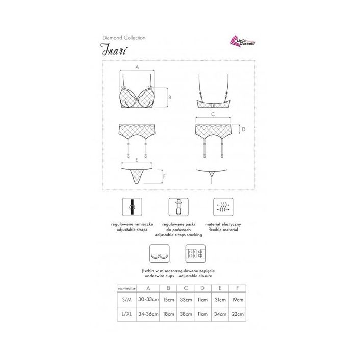 Het Inari Lingerie Setje met Jarretels komt uit de Diamond collectie van Livco Corsetti en dat is duidelijk te zien aan subtiele diamanten patroon op het doorschijnende tule, afgewerkt met glitter details en roze strikjes. Dit lingerie setje bestaat uit een bh met ongevoerde beugel cups, een jarretelgordel en een bijpassende string. De bh en jarretelgordel zijn beiden voorzien van verstelbare bandjes voor een perfecte pasvorm. De set is gemaakt van zachte en soepele materialen voor een hoogwaardig draagcomfort.