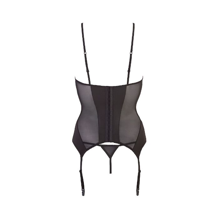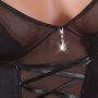 Deze stijlvolle set van Cottelli Collection is gemaakt van mat zwart en doorschijnend zwart materiaal. De mat zwarte en doorschijnende stof wisselen elkaar in schuine banen af, waardoor je taille optisch smaller zal lijken. De top heeft een diep decolleté met sieraad en een half blote rug. Onderaan de top zijn jarretelbandjes bevestigd zodat de top gemakkelijk is te combineren met kousen. De bijpassende string is ook licht doorschijnend voor een complete uitdagende look.