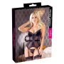 Met dit verleidelijke setje aan geef jij je figuur een boost. De jarretel Top is gemaakt van transparant mesh met kanten belijningen. Het patroon geeft een afslankend effect aan je figuur. In de taille is een fluwelen riempje aangebracht met op het midden een grote ronde gesp met strass steentjes. De onderkant van de cups zijn ook van fluweel gemaakt. De bijpassende string is transparant en bedekt enkel het kruis.