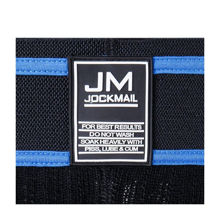 Een klassieke jockstrap met een fetish randje. Dat is de JM226 Double Butts Wide Bar Jock - Blauw van Jockmail. Deze klassieke jockstrap is gemaakt van gekamd katoen van hoge kwaliteit. Het katoen zorgt voor een zacht en luchtig draagcomfort. De zwarte stof is afgewerkt met blauwe details. Aan de voorkant van de extra brede tailleband is een wasvoorschrift aangebracht waarvan het schaamrood je op de kaken komt te staan.
