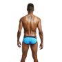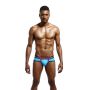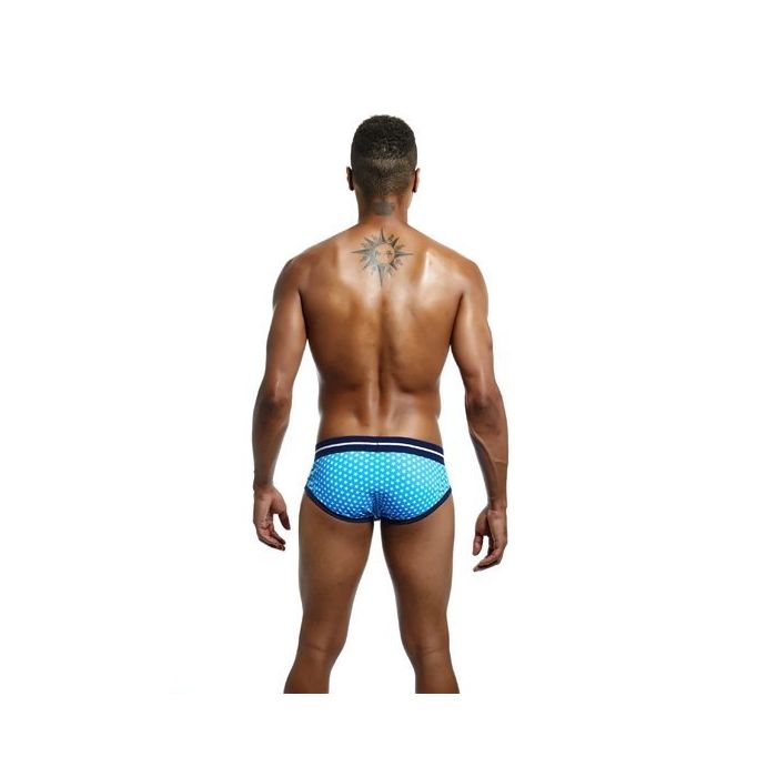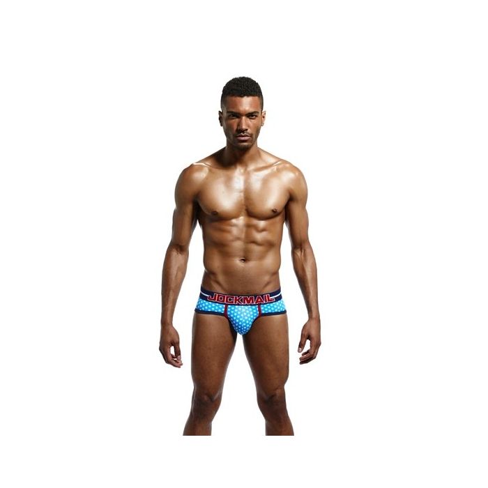 De Jockmail JM315 Americana Slip - Aqua heeft een sportieve Amerikaanse look door het witte sterren patroon op de aqua kleurige achtergrond en de klassieke afwerking met soepele rode zomen. De Jacquard geweven, donkerblauwe tailleband zit lekker laag om de heupen en is afgewerkt met een stijlvolle witte lijn rondom en het Jockmail logo voorop in het rood. Het zachte katoen is van hoge kwaliteit en is gemixt met Spandex voor een geweldig hoog draagcomfort en een perfecte strakke pasvorm. De sportieve heren slip is geschikt om in te sporten door het lucht doorlatende en zweet bestendige materiaal.