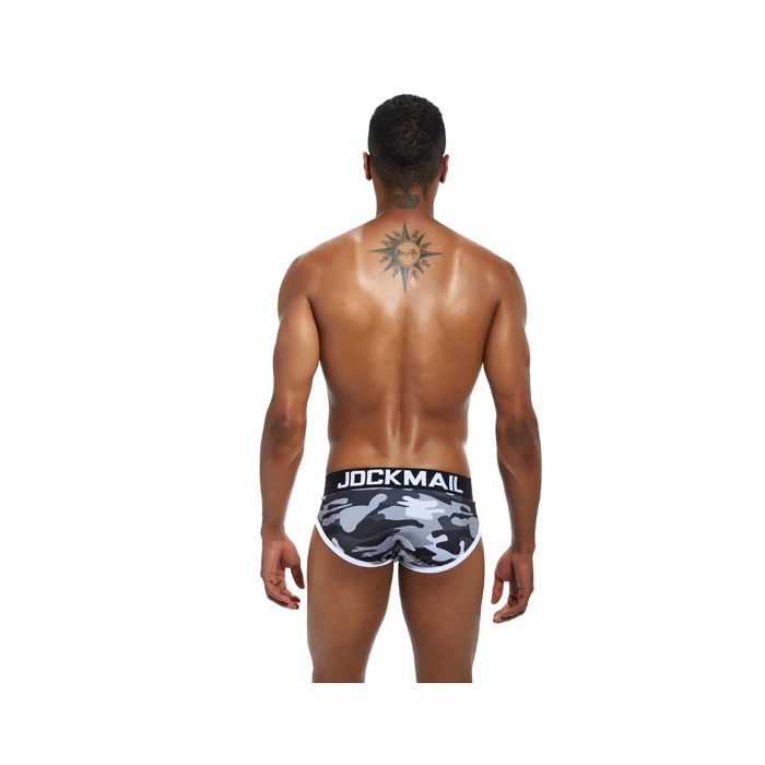 Ga voor een stoere en sexy look met de JM321 Camouflage Slip - Grijs van het merk Jockmail. De slip zit lekker laag om de heupen en sluit goed aan op jouw mannelijke lichaam. Het super zachte katoen is lucht doorlatend en zweet resistent wat de slip geschikt maakt om te dragen tijdens het sporten, of andere intensieve activiteiten. De elastische tailleband en de zomen zorgen voor extra draagcomfort en de grijze camouflage print zorgt voor een spannende uitstraling.