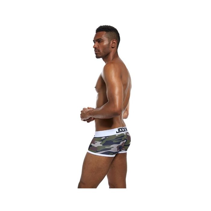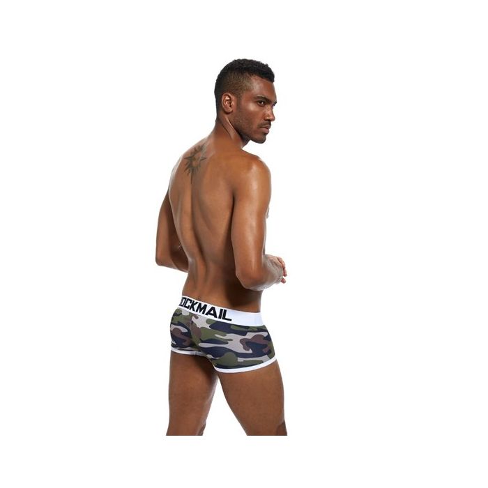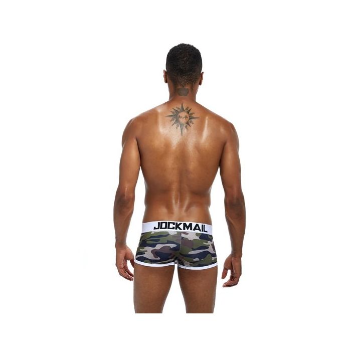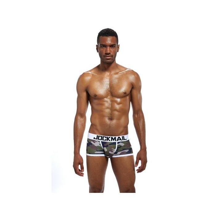 In de Jockmail JM413 Camouflage Boxer - Wit zit je zeker goed! Deze boxershort heeft een camouflage print in natuurlijke kleuren en is afgewerkt met verstevigende zomen en een elastische tailleband in het wit. Naast een stoere design zit deze boxer ook nog eens super lekker, door het gebruik van super zacht, lucht doorlatend en zweet bestendig katoen met stretch kwaliteit.