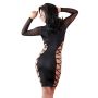 Deze stijlvolle jurk komt uit de Party lijn van het merk Cottelli Collection en maakt van jouw decolleté, een decolleté om van te dromen! De jurk heeft een lekkere strakke pasvorm, lange mouwen van licht doorschijnend tule en komt tot net boven de knie. Aan de zijkanten van de jurk zijn grote uitsparingen gemaakt, welke zijn afgewerkt met gekruiste rijglinten en zilverkleurige gespen voor een zeer gevaarlijke look. In deze jurk ben jij een ware eyecatcher!