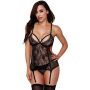 Deze zwarte set heeft doorschijnende kanten beugelcups met details, verstelbare spaghettibandjes, een eye-back sluiting, een transparant net en kanten lijfje, een open rug, verstelbare jarretelles en een bijpassend slipje.