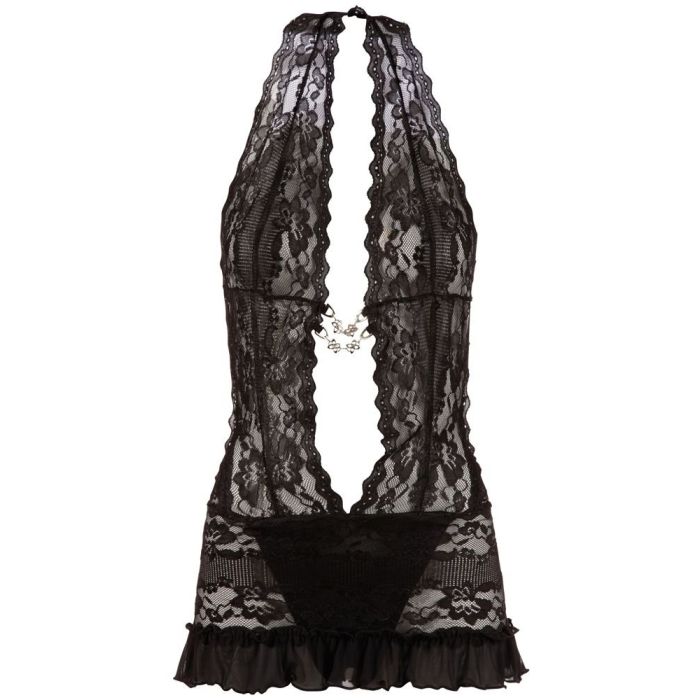 Dit prachtige pikante jurkje van Cottelli Collection is geheel gemaakt van zacht, flexibel zwart kant en heeft een zeer diep decolleté. Net onder de buste zijn twee sierkettinkjes aangebracht die je borsten accentueren voor een sexy look. Dit mini jurkje met halter sluiting is zo kort dat het maar net je billen bedekt. Er is een kruisloze string aan het topje vastgenaaid zodat je lekker snel toegankelijk bent. Met dit kanten jurkje aan word je meteen een heerlijk seks presentje voor je partner.
