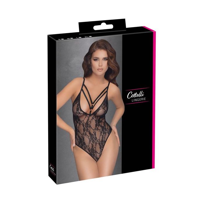 Hul jouw lichaam volledig in weelderig bloemen kant met de Kanten String Body - Zwart van Cottelli Collection. Het zachte kant streelt het lichaam en zorgt voor een sensuele aanraking. Het extreem verleidelijk laag uitgesneden decolleté is voorzien van speelse bandjes. De bandjes zijn net als de schouderbandjes te verstellen en bevestigd met goudkleurige ringen. De speelse bandjes accentueren de borsten.