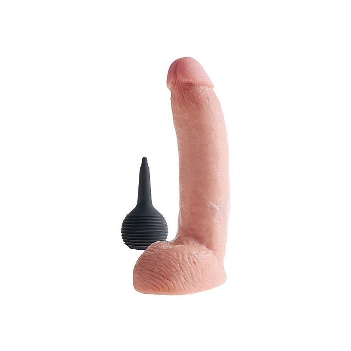 Deze grote, dikke King Cock Spuitende Dildo is ultra-realistisch en zal al je verlangens naar 'cum-play' bevredigen! Hij is helemaal met de hand gemaakt met een fantastisch oog voor detail. De geaderde schacht zorgt voor extra stimulatie. De dikke, volle balzak spreekt zeer tot de verbeelding en met een beetje fantasie stel je je voor dat hij jou heerlijk volspuit aan het eind van elke solosessie.