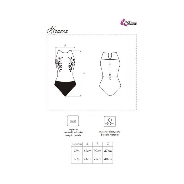 De super elegante en sexy Kiraven Luxe Body van Livco Corsetti. Deze prachtige body heeft een doorzichtig lijfje met sierlijke hand geborduurde details. Onderaan het lijfje is de body gemaakt van glanzend zwart satijn. Ook de gehele rug is gemaakt van luxe satijn en afgewerkt met satijnen knoopjes.