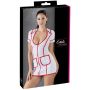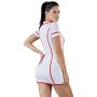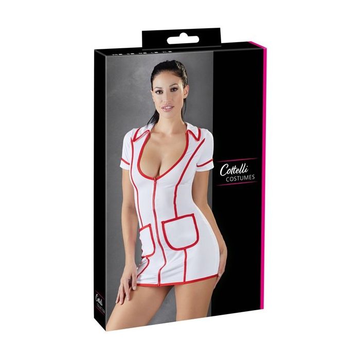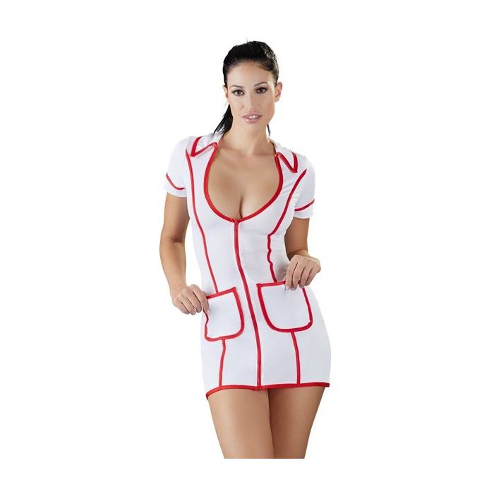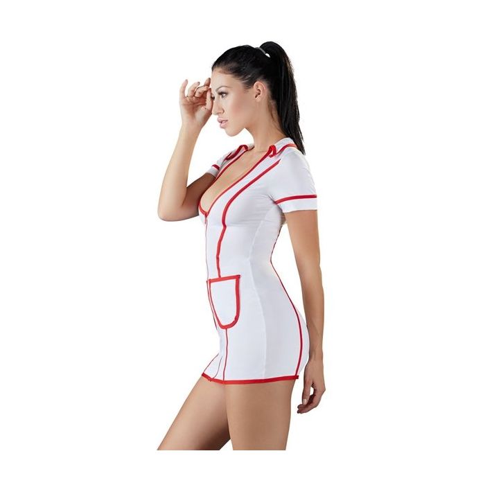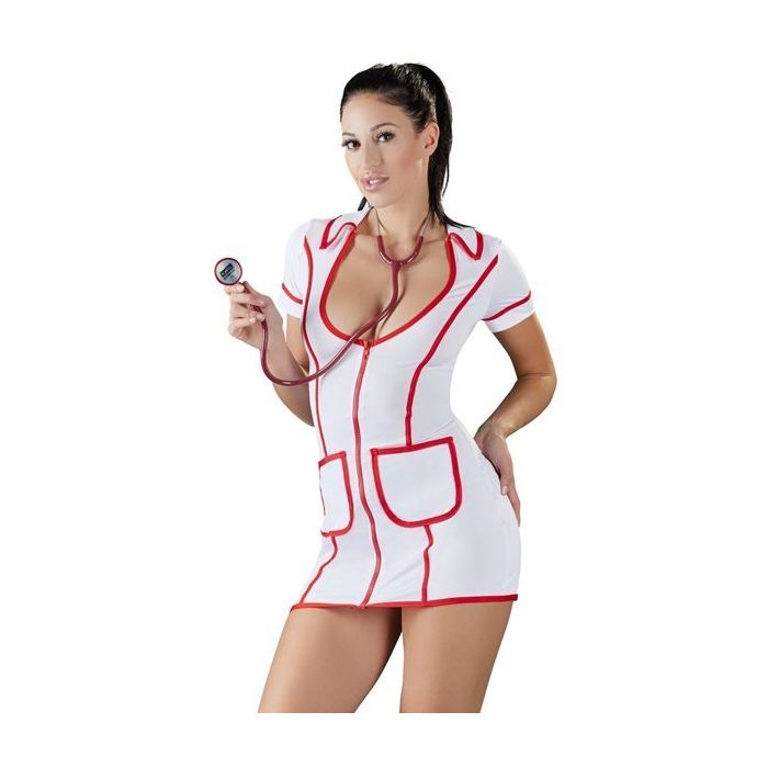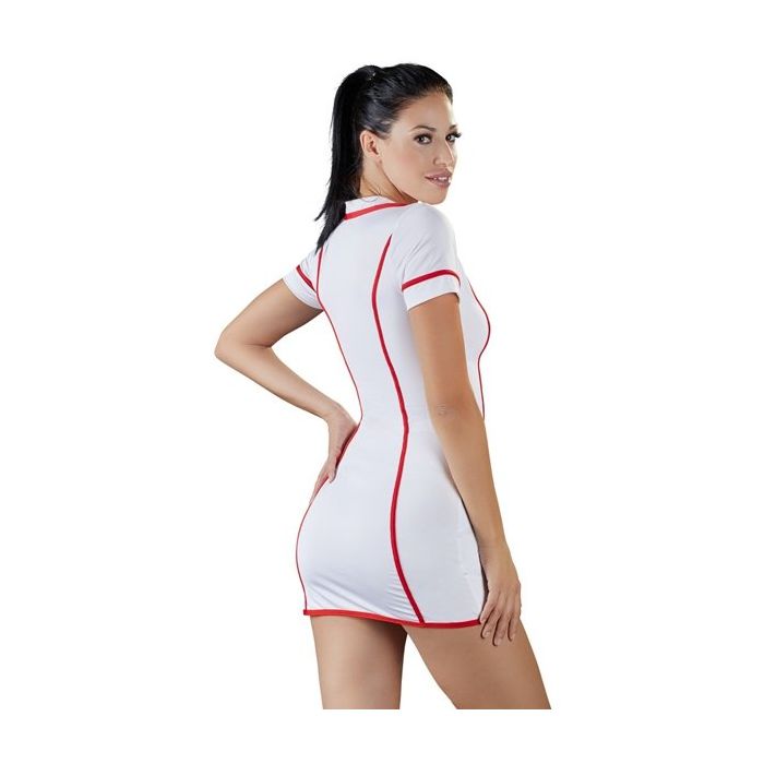 Het jurkje is gemaakt van witte stretch stof met rode accenten. Het laag uitgesneden decolleté zorgt voor een verleidelijk buste en de rode belijning met rode rits heeft de vorm van een stethoscoop. Het jurkje heeft een speels kraagje, korte mouwen en 2 zakjes aan de voorkant.