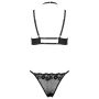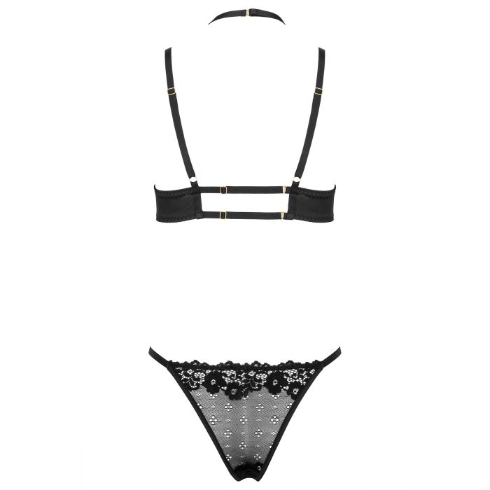 De set bestaat uit een prachtig gevormde bh die je de juiste ondersteuning biedt, terwijl de bijpassende string je figuur op een verleidelijke manier accentueert. De bh is voorzien van verstelbare bandjes, zodat je de pasvorm kunt aanpassen aan jouw wensen. De combinatie van het zachte kant en de subtiele afwerking zorgt ervoor dat je je zelfverzekerd en aantrekkelijk voelt, of je nu een speciale gelegenheid hebt of gewoon jezelf wilt verwennen.