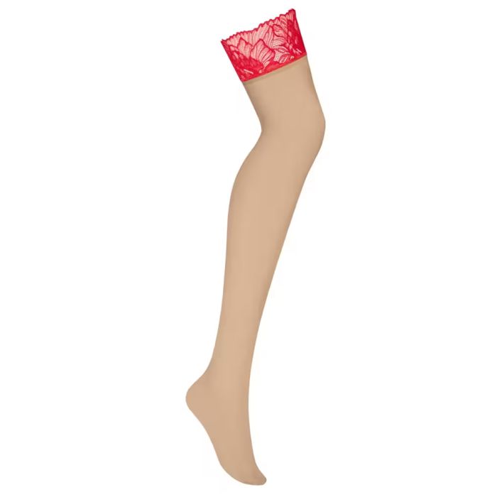 Deze nude-kleurige kousen zijn niet alleen een lust voor het oog, maar bieden ook comfort. De brede elastische rand, versierd met elegant rood kant, zorgt ervoor dat de kousen perfect op hun plaats blijven zitten, zonder in te snijden. Of je nu een speciale gelegenheid hebt of gewoon jezelf wilt verwennen, deze kousen geven je een gevoel van luxe en verfijning.