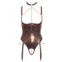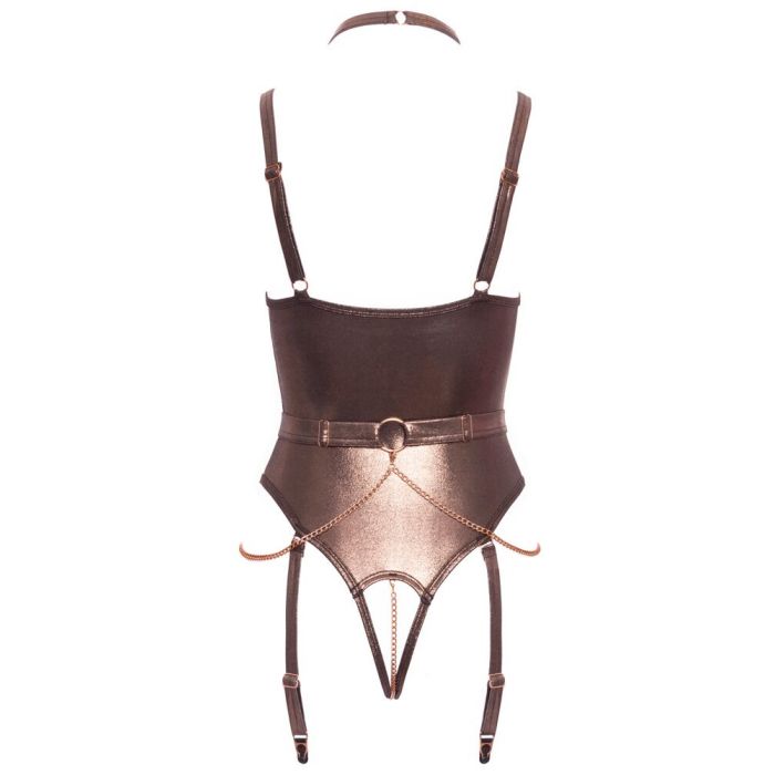 Maak kennis met de Kruisloze Jarretel Body in een betoverend brons goud, een luxe creatie van Abierta Fina die glamour en sensualiteit perfect combineert. Deze body is ontworpen voor ultiem comfort met een elastische, zachte stof die zich moeiteloos aanpast aan jouw lichaam. De elegante roségoudkleurige accessoires en decoratieve kettingen voegen een sprankelende touch toe, terwijl de licht gevoerde beugelcups zorgen voor een perfecte pasvorm zonder dat je je zorgen hoeft te maken over een zichtbare bh. Het volledig open kruis met een afneembare ketting biedt een speelse, uitdagende uitstraling, en de afneembare jarretelbandjes geven je de vrijheid om je look aan te passen. De bijgeleverde choker en riem in brons goud tillen je outfit naar een hoger niveau van glamour, en met de fijne karabijnkettingen kun je ze eenvoudig aan de ringen van de bodybandjes bevestigen. Bovendien zijn de kraag, riemen, riem en jarretelgordel verstelbaar, zodat je altijd de perfecte fit kunt creëren. Dit is de must-have toevoeging aan jouw lingeriecollectie voor een onvergetelijke avond!