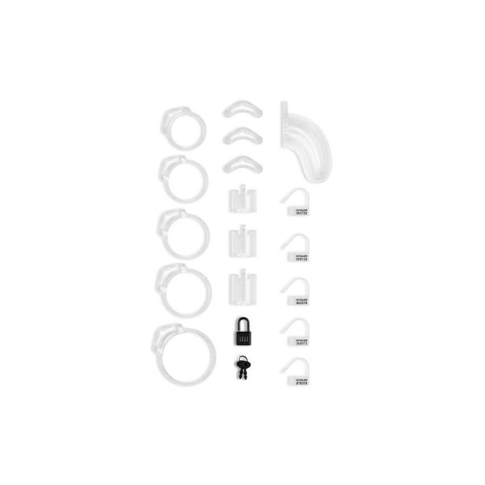 Deze geweldige set wordt geleverd met vijf ringen in verschillende maten (4,5 - 6,5 cm), zodat je altijd de perfecte pasvorm kunt vinden. Daarnaast bevat de set een metalen hangslot met twee sleutels en vijf plastic genummerde hangsloten. De plastic sloten kunnen eenvoudig met een schaar worden verwijderd na gebruik, maar de unieke nummers op elk slot zorgen ervoor dat de drager de chastity cage niet stiekem kan verwijderen en een nieuw slot kan aanbrengen zonder betrapt te worden.