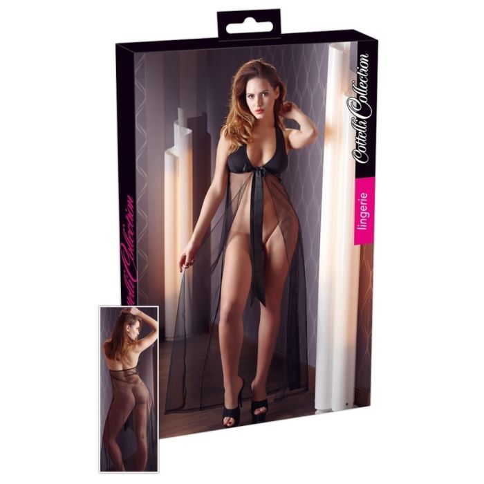 Voel jij je extra sexy vanavond? In deze lange chemise uit de Cottelli Collection zul jij je zelfs nóg verleidelijker voelen! Deze chemise met halter model is gemaakt van doorzichtig zwart tule en heeft mat zwarte cups. Tussen de cups is deze nachtjurk versierd met een grote strik van satijn, waarvan de linten voor je kruis langs hangen wat een spannende look geeft. Geef jezelf cadeau in deze chemise en laat je uitpakken door je partner.