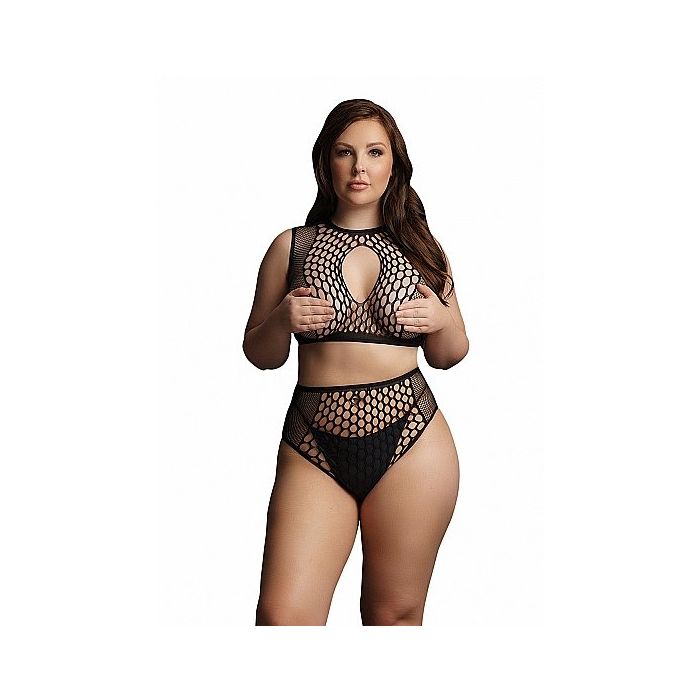 Ben je op zoek naar een mooie set om te dragen onder dat geweldige festival jurkje? Ga dan voor de Duo Visnet Keyhole Lingerieset - Zwart van Le Désir. Deze tweedelige set met crop top en slip met hoge taille heeft een combinatie van fijn en grof visnet materiaal met opengewerkte keyhole details aan de voor en achterzijde. De zachte, superelastische stof is geschikt voor maten XL tot 4XL en heeft een perfecte pasvorm.