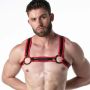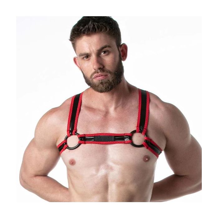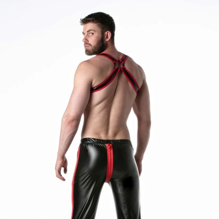 Dit stretchy leatherette harnas is ontworpen met een sportieve uitstraling en is voorzien van details van sports mesh stof voor een comfortabele pasvorm en een sterke fetisj uitstraling. Het harnas is gemaakt van een elastisch kunstleer materiaal dat zich gemakkelijk aanpast aan de contouren van het lichaam, waardoor het comfortabel en flexibel is om te dragen. De sports mesh stofpiping voegt een stoer en sportief element toe aan het harnas, waardoor het een opvallende en verleidelijke uitstraling heeft.