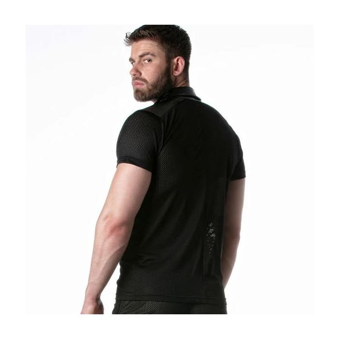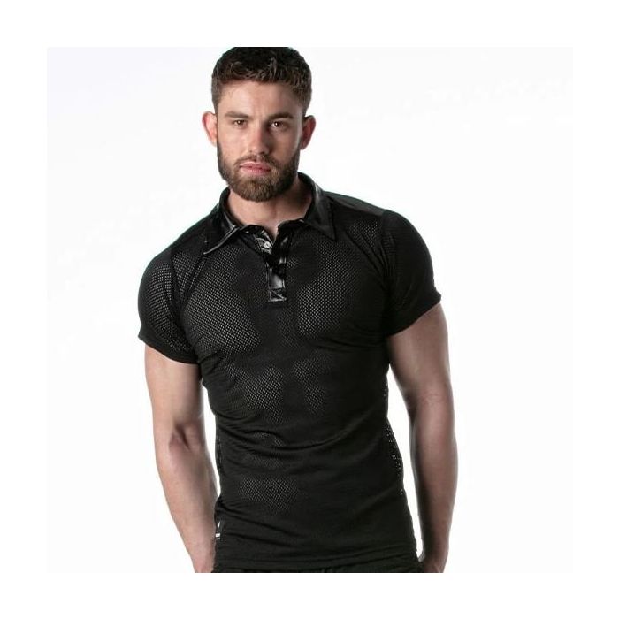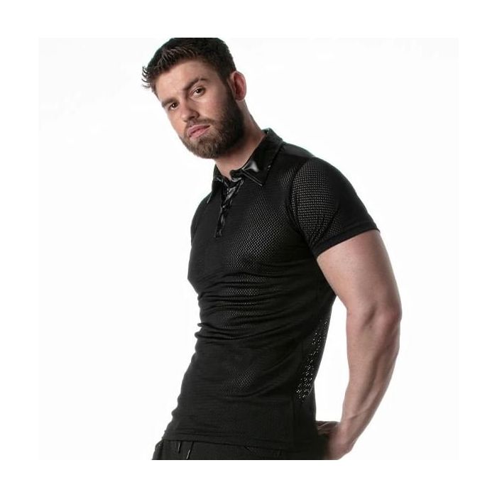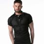 Deze veelzijdige top is gemaakt van rekbaar sportgaasweefsel voor een comfortabele pasvorm. Het heeft een kraag en knoopsluiting van imitatieleer, evenals details op de schouders. Op de linkerborst is een zwarte LEADER-logo te vinden. Deze top kan op verschillende manieren gestyled worden, of het nu voor een stoere fetisj-look is of voor een nette casual uitstraling. Het materiaal zorgt voor een comfortabele pasvorm, terwijl de leren details en de print een unieke uitstraling geven aan deze top.
