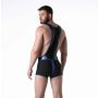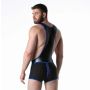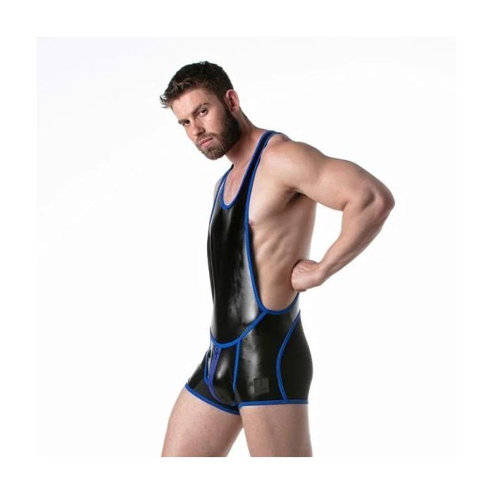 Deze stretchy leren worstelsinglet met spandex detail rond de billen is een opvallend en uitdagend kledingstuk. Het materiaal is gemaakt van imitatieleer, waardoor het een stoere en sexy uitstraling heeft. De toevoeging van spandex rond de billen zorgt voor extra flexibiliteit en comfort tijdens het worstelen. Deze singlet is voorzien van twee aparte ritsen, één aan de voorkant voor toegang tot het kruis en één aan de achterkant voor gemakkelijke toegang tot de rug. Dit maakt het niet alleen praktisch, maar voegt ook een speels element toe aan het ontwerp. Op de linker dij is discreet het merklabel van LEADER aangebracht, gemaakt van silicone. Dit geeft het kledingstuk een exclusieve uitstraling. Al met al heeft deze worstelsinglet een sterke fetisj uitstraling en is het perfect voor liefhebbers van uitdagende en opvallende kleding.