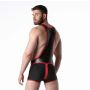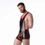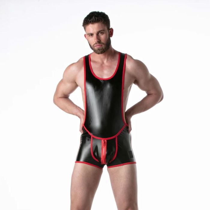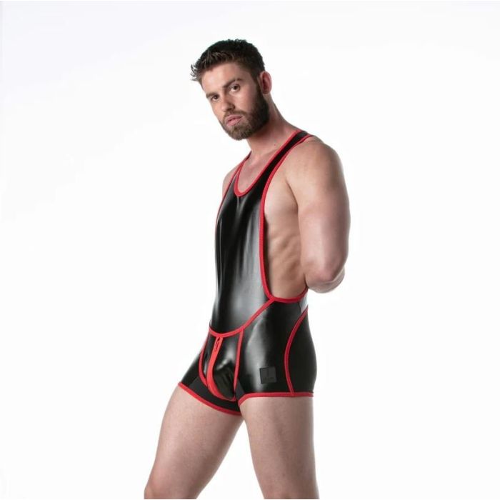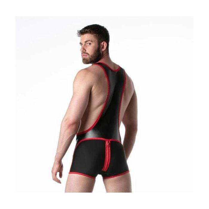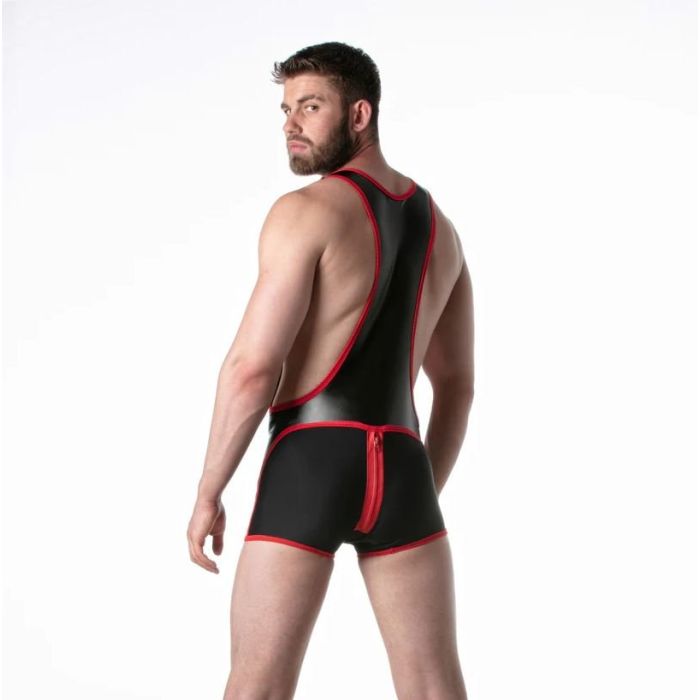 Deze stretchy leren worstelsinglet met spandex detail rond de billen is een opvallend en uitdagend kledingstuk. Het materiaal is gemaakt van imitatieleer, waardoor het een stoere en sexy uitstraling heeft. De toevoeging van spandex rond de billen zorgt voor extra flexibiliteit en comfort tijdens het worstelen. Deze singlet is voorzien van twee aparte ritsen, één aan de voorkant voor toegang tot het kruis en één aan de achterkant voor gemakkelijke toegang tot de rug. Dit maakt het niet alleen praktisch, maar voegt ook een speels element toe aan het ontwerp. Op de linker dij is discreet het merklabel van LEADER aangebracht, gemaakt van silicone. Dit geeft het kledingstuk een exclusieve uitstraling. Al met al heeft deze worstelsinglet een sterke fetisj uitstraling en is het perfect voor liefhebbers van uitdagende en opvallende kleding.