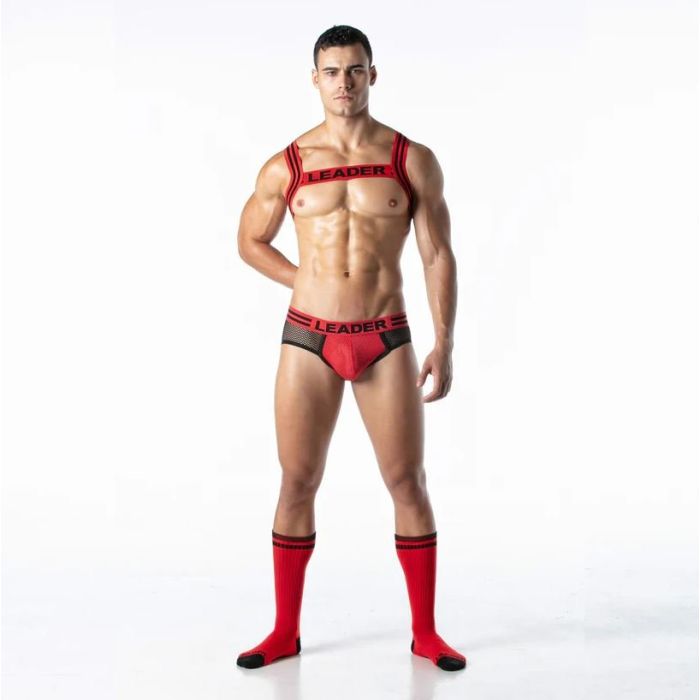 Deze hoogwaardige jacquard elastische fetish harnas heeft een breedte van 4 cm. Het is gedetailleerd met contrasterende strepen en het LEADER-logo op de borst in een contrasterende kleur, evenals een leren LEADER-label op het kruisgedeelte aan de achterkant voor een krachtige fetish uitstraling. Het harnas is gemaakt van duurzaam materiaal en biedt een comfortabele pasvorm. De elastische band zorgt ervoor dat het harnas goed op zijn plaats blijft zitten tijdens het dragen. Met zijn opvallende design en gedurfde details is dit harnas perfect voor liefhebbers van fetisjmode. Het is geschikt voor zowel mannen als vrouwen en kan worden gedragen tijdens intieme momenten of als een opvallend accessoire bij speciale gelegenheden. Of je nu een fetisjfeest bijwoont of gewoon je eigen stijl wilt uitdrukken, dit harnas zal zeker de aandacht trekken. Het is een uniek stuk dat je outfit een extra vleugje verleiding en sensualiteit geeft. Met de LEADER-logo's en het leren label straalt dit harnas kwaliteit en vakmanschap uit. Het is een must-have voor iedereen die op zoek is naar een stijlvolle en gedurfde toevoeging aan hun fetisjcollectie.