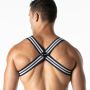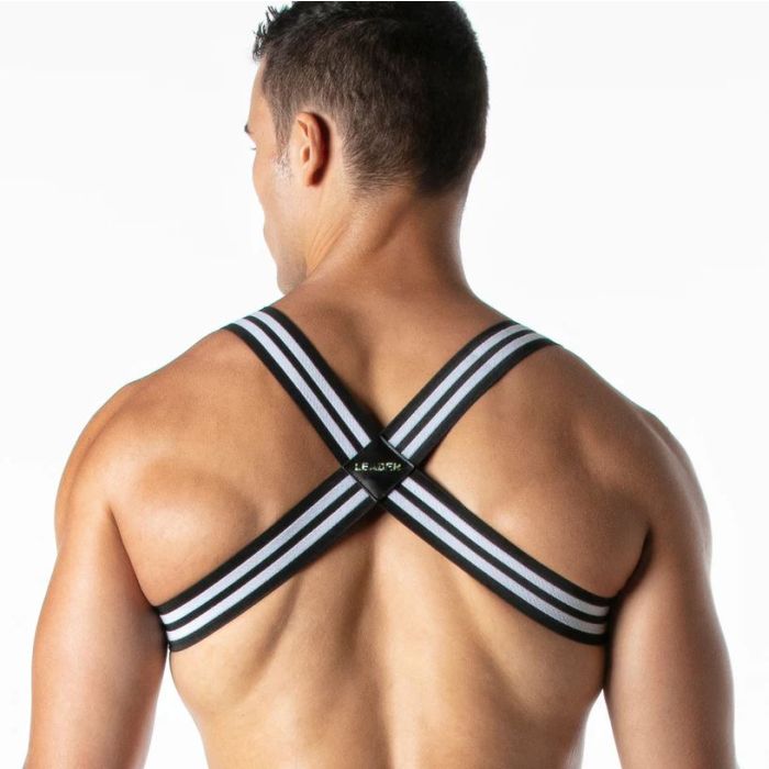 Deze hoogwaardige jacquard elastische fetish harnas heeft een breedte van 4 cm. Het is gedetailleerd met contrasterende strepen en het LEADER-logo op de borst in een contrasterende kleur, evenals een leren LEADER-label op het kruisgedeelte aan de achterkant voor een krachtige fetish uitstraling. Het harnas is gemaakt van duurzaam materiaal en biedt een comfortabele pasvorm. De elastische band zorgt ervoor dat het harnas goed op zijn plaats blijft zitten tijdens het dragen. Met zijn opvallende design en gedurfde details is dit harnas perfect voor liefhebbers van fetisjmode. Het is geschikt voor zowel mannen als vrouwen en kan worden gedragen tijdens intieme momenten of als een opvallend accessoire bij speciale gelegenheden. Of je nu een fetisjfeest bijwoont of gewoon je eigen stijl wilt uitdrukken, dit harnas zal zeker de aandacht trekken. Het is een uniek stuk dat je outfit een extra vleugje allure geeft. Met de LEADER-logo's en het leren label straalt dit harnas kwaliteit en vakmanschap uit. Het is een must-have voor iedereen die op zoek is naar een stijlvolle en gedurfde toevoeging aan hun fetisjcollectie.