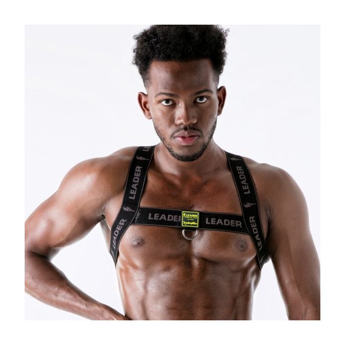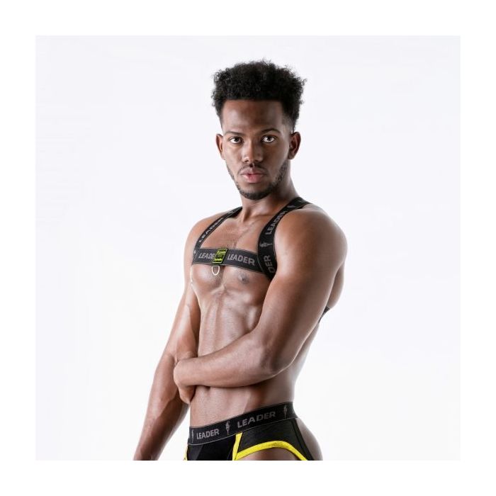 Laat jouw gespierde schouders nog breder lijken in het Redemption Harnas - Geel van Leader Menswear. Dit harnas is geheel gemaakt van elastische banden. De banden zijn zwart met daarin het Leader logo en Torch symbool verweven met grijs garen. Op de voorkant is het rubberen Leader embleem met gele details aangebracht.