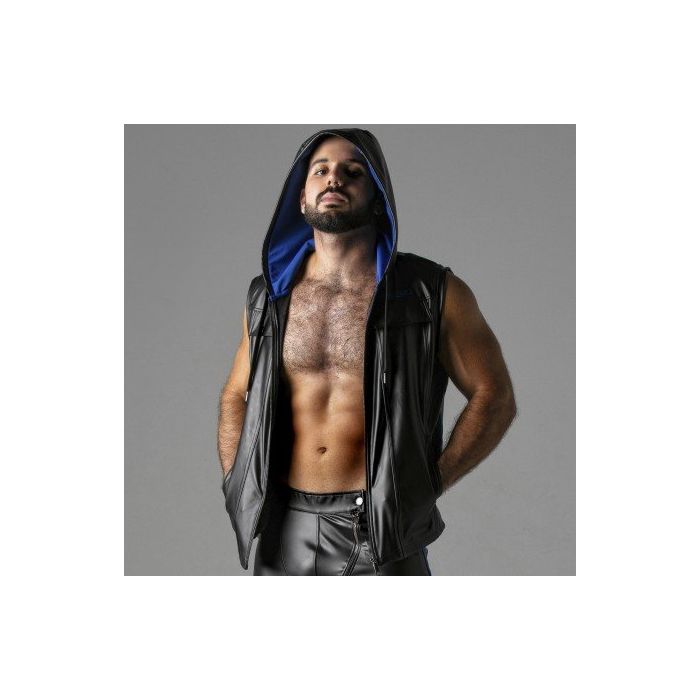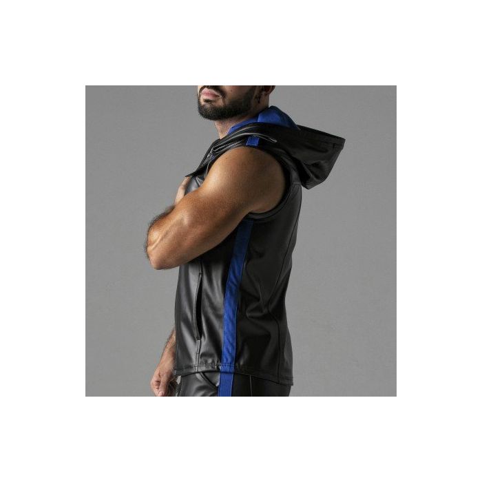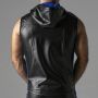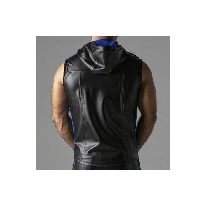 Verleid je partner met de fetisj-meets-sports look en ga op avontuur! Deze hoody heeft alles wat je wenst van een prachtige fetisj hoody, namelijk: de hoody is gemaakt van kunstleder, heeft een dubbellaagse capuchon en is mouwloos voor een extra spicy look. Ook heeft de hoody speelse contrasterende strepen en zakken op het voorpand. De hoody is eenvoudig te combineren met andere fetisj-meets-sports artikelen. Daarnaast kun je de hoody zowel op in de club of gewoon als streetwear dragen.