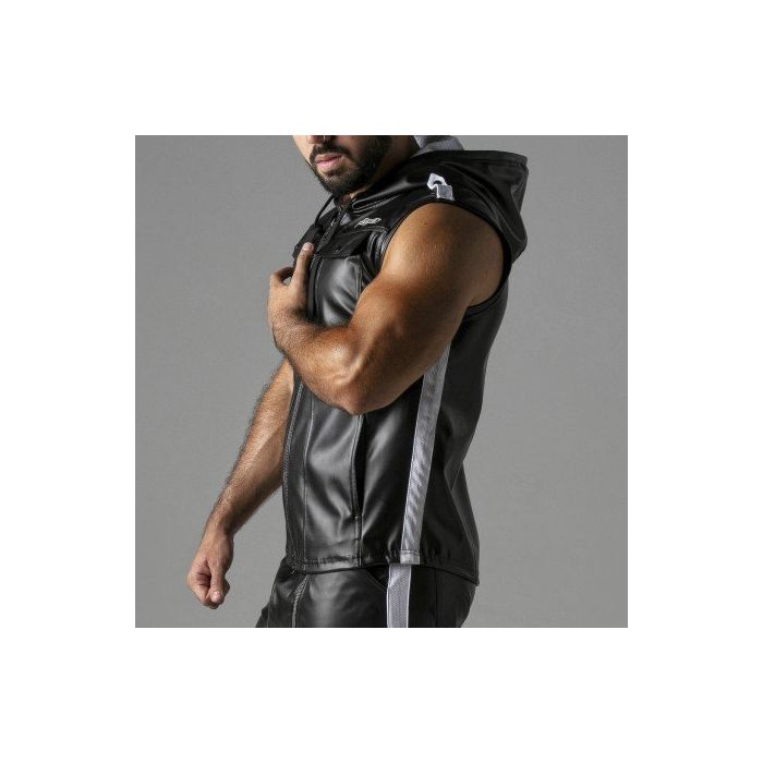 Ga voor dé perfecte sporty meets fetisj look in deze té gekke hoody in de kleur wit van het merk Locker Gear. De hoody is perfect om te dragen in de club of gewoon als streetwear. De hoody is gemaakt van soepel, glanzend, en glad kunstleder waardoor het een spicy uitstraling krijgt. Daarnaast beschikt de hoody over contrasterende strepen in de kleur wit voor een speels effect en is de hoody mouwloos. Combineer de hoody met andere bijpassende fetisj artikelen voor de gehele kinky look!