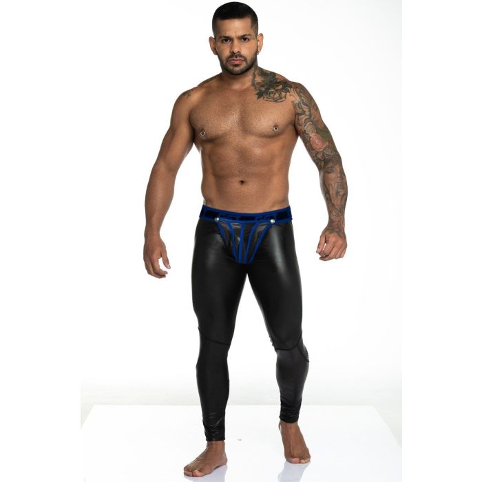 Verleid je partner met het dragen van deze spannende legging. Deze mannen legging of megging, is fetisj geïnspireerd en laat je mannelijkheid stralen. De megging heeft een strakke maar comfortabele pasvorm waardoor je veel plezier zult beleven met het dragen van deze legging. De stof van de legging is licht glanzend waardoor het een luxe uitstraling krijgt. Ook heeft de megging contrasterende blauwe strepen waardoor het een speelse look krijgt. De buidel is door middel van drukknopen gemakkelijk te openen en is licht gevoerd voor meer opwinding.