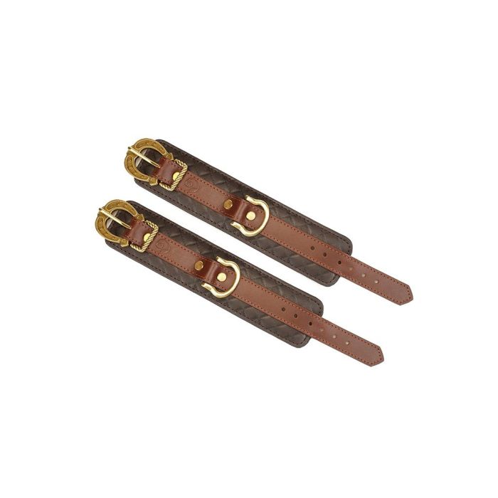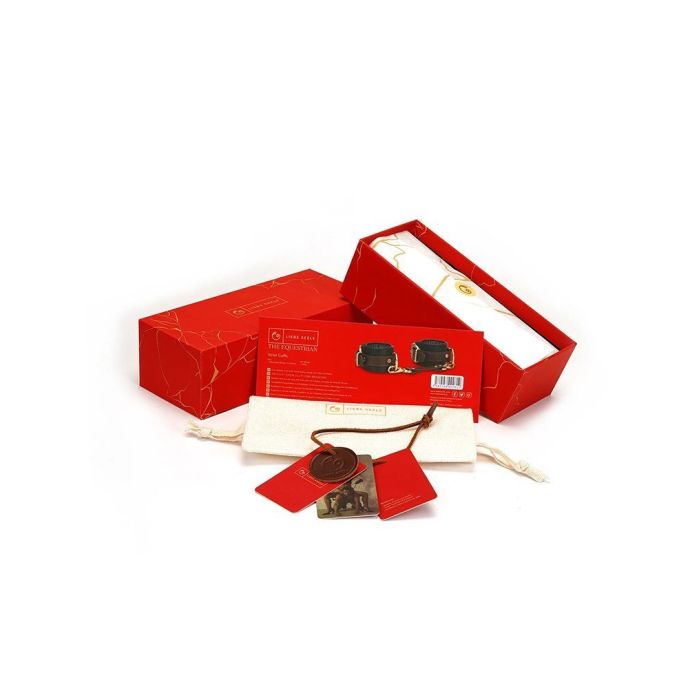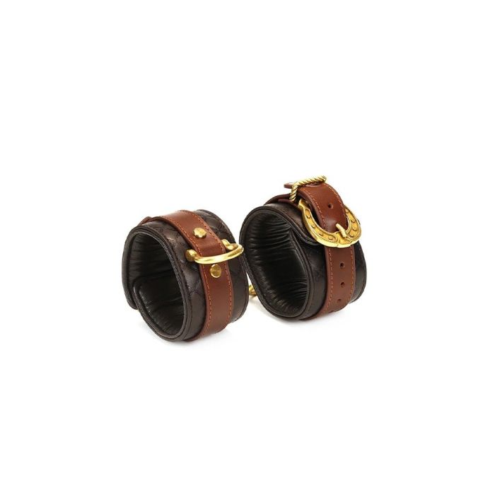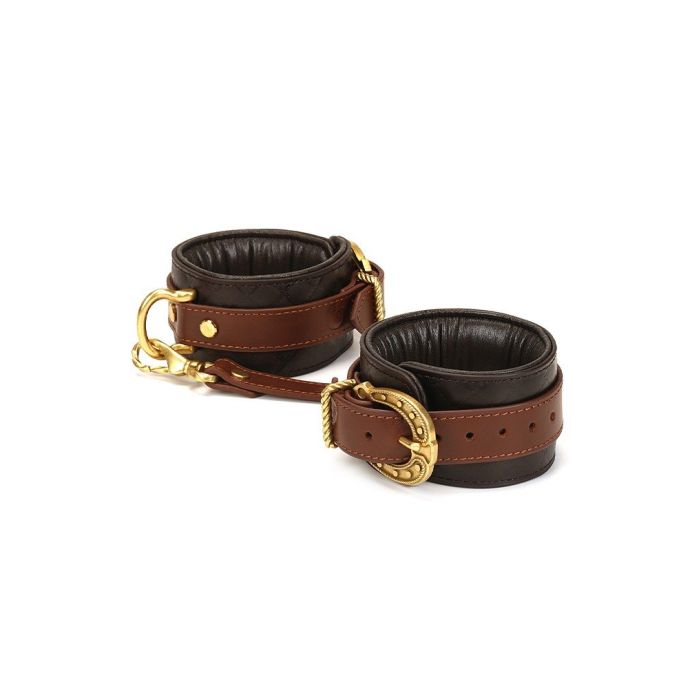 Deze handgemaakte polsboeien van het merk Liebe Seele zijn gemaakt van echt rundleer en zijn in twee kleuren en texturen. De binnenkant is rijk gewatteerd en gevoerd met lamsleer voor extra comfort. De boeien zijn verstelbaar tussen 14 en 20,5 cm en zijn verfraaid met The Equestrian kenmerkende accenten in het goud. Een perfecte aanvulling op elke bondagecollectie.