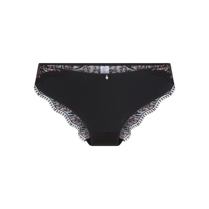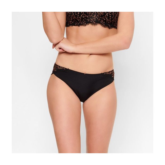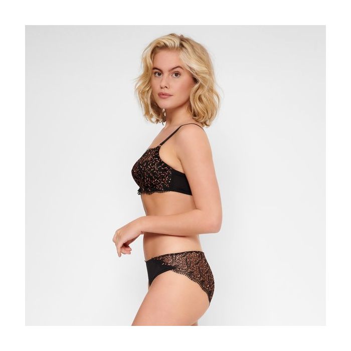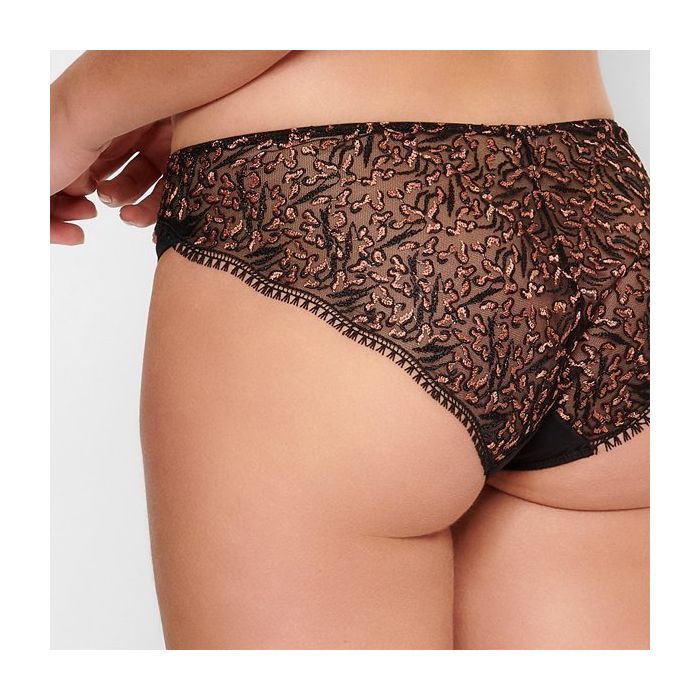 De slip heeft een gladde en zachte, egaal zwarte voorkant. De voorkant is afgewerkt met een koperkleurig hangertje. De achterkant van de slip is geheel gemaakt van semi-transparant micro mesh. Het micro mesh heeft speels gewimperde randjes en is versierd met geborduurde bloesems, van koperkleurig garen. De koper tinten geven een warme uitstraling.