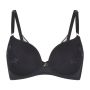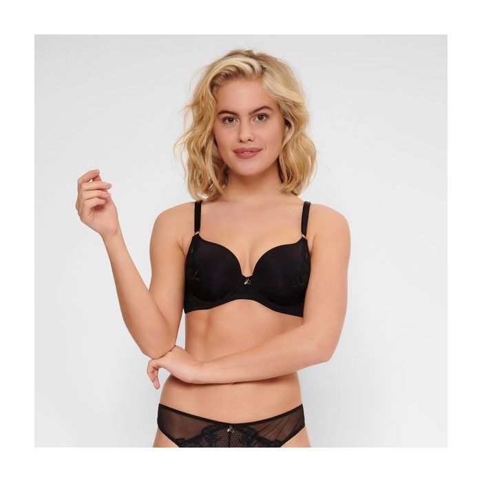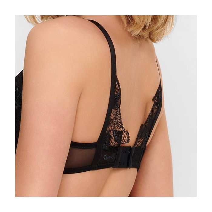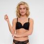 De gladde cups zijn deels versierd met guipure kant. Het guipure kant heeft honingraad structuur en sierlijk geborduurde details voor een luxe uiterlijk. Het kant komt terug aan de achterkant waar het tegen de schouderbandjes aan omhoog loopt. Tussen de cups is een zilverkleurig bedeltje aangebracht. De achterkant is gemaakt van micro mesh en voorzien van een haaksluiting.