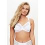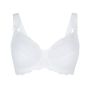 Het sierlijke bloemen kant heeft geschulpte randjes. Het witte kant geeft een heerlijk romantische look. De schouderbandjes zijn breder dan standaard bh bandjes en het kant loopt erover door. De brede band rondom draagt bij aan de goede steun die deze bh biedt. Op de rug is een haaksluiting met 3 standen gemaakt.