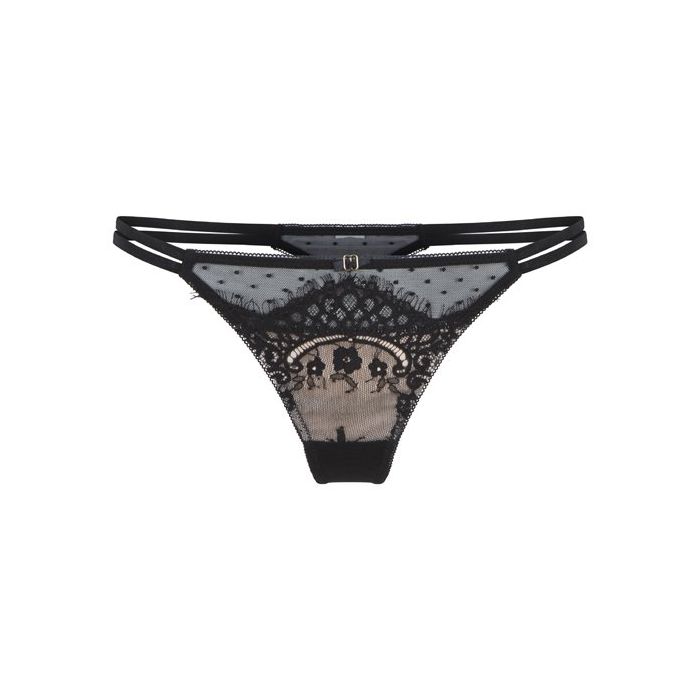 Zwart, gewimperd kant, doorzichtig tule met speelse stipjes en elegant smalle bandjes. Door het kant heen is de satijnen stof eronder te zien in champagne kleur voor een luxe uitstraling. Het goudkleurige detail aan de voorkant maakt het helemaal af.