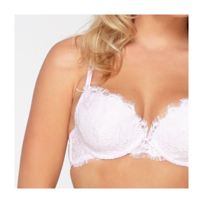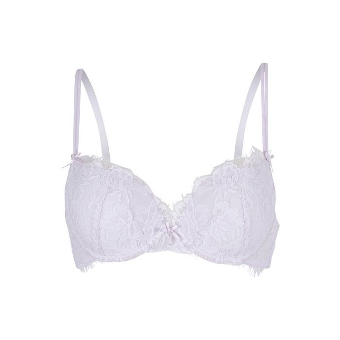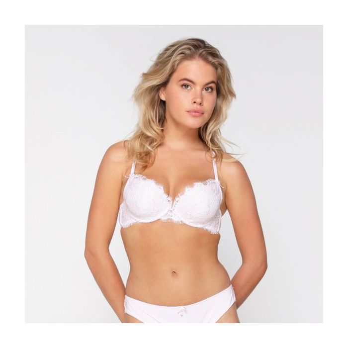 De bh heeft met gel gevulde push up cups, ondersteunende beugels en baleinen in de zijkanten. De cups zijn overtrokken met weelderig bloemen kant. De geschulpte en gewimperde randjes steken over de randen van de bh voor een fantastisch mooi effect. Tussen de cups is een sieraad aangebracht voor een luxe afwerking. De schouderbandjes zijn aan de voorkant dubbel en aan de achterkant plat en verstelbaar.