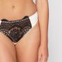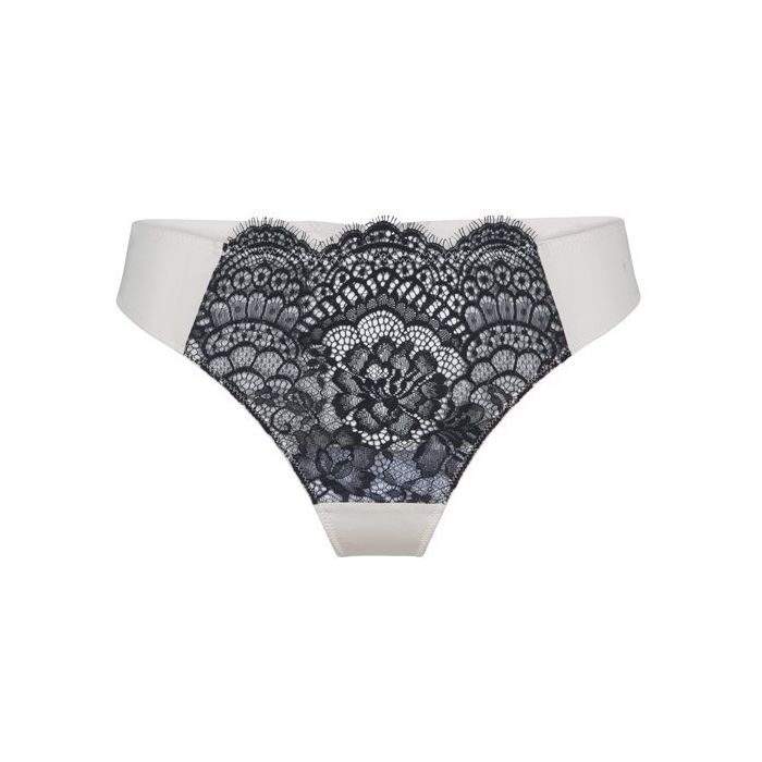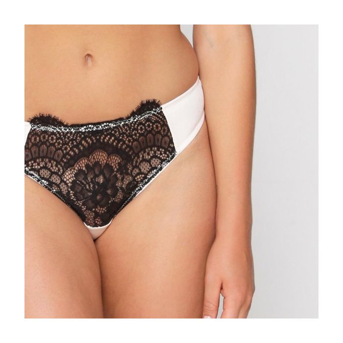 De voorkant van de string is gemaakt van zwart kant met een sierlijk design. De bovenrand van het kant is geschulpt en gewimperd en steekt speels uit. Vanaf de heupen loopt poeder roze satijn door naar de achterkant. In de achterkant is een uitsparing gemaakt met lintjes die door een ringetje zijn gehaald. Het kruis is gevoerd met katoen voor een luchtig comfort.