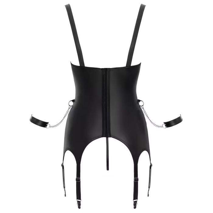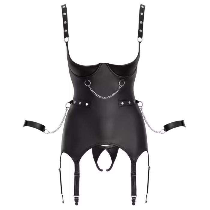 Deze set bestaat uit een open cup jarretelhemd, een kruisloze string en zachte handboeien, allemaal ontworpen om je zelfvertrouwen een boost te geven. Het jarretelhemdje heeft licht gewatteerde beugelcups voor een verleidelijke pasvorm en een matte look die je figuur prachtig accentueert. Met verstelbare bandjes en decoratieve drukknopen kun je de pasvorm helemaal naar jouw wensen aanpassen. De 6 opgenaaide jarretelbandjes zijn ook verstelbaar.