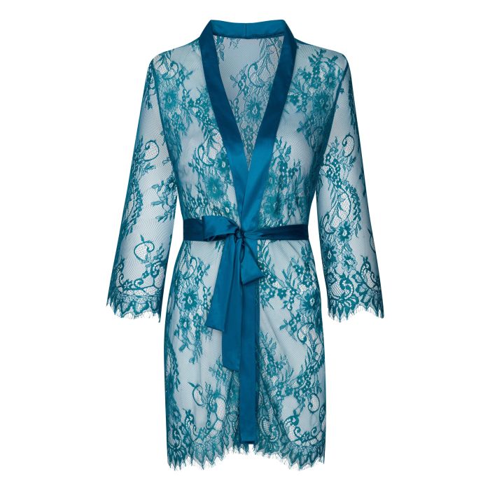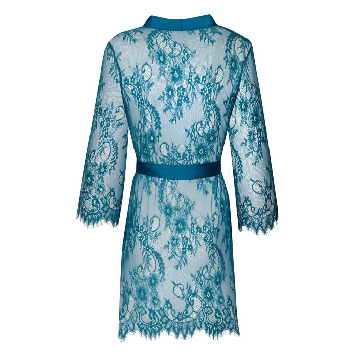 De Bluebird badjas is een perfecte keuze voor vrouwen die op zoek zijn naar een stijlvolle en vrouwelijke uitstraling. Deze badjas is gemaakt van polyamide, wat zorgt voor een uiterst aangename textuur op het lichaam. Het materiaal is zacht en veroorzaakt geen ongemak, zelfs niet als je het direct op de blote huid draagt. De badjas heeft een klassieke uitlopende halslijn, afgewerkt met een glanzend lint, wat een vleugje elegantie toevoegt. De lange mouwen en de bies aan een glanzend lint in de taille zorgen voor een mooie pasvorm en accentueren het vrouwelijke silhouet. De bedekking reikt tot het midden van de dijen en bedekt op subtiele wijze de heupen en billen, waardoor het zowel comfortabel als flatterend is. Wat de Bluebird badjas echt uniek maakt, is het prachtige kanten ontwerp met gekartelde randen. Dit geeft de badjas een verleidelijke en elegante uitstraling. Het model is verkrijgbaar in een interessante en edele tint zeegroen, waardoor je nachtoutfit er echt uniek uitziet en karakter krijgt. Om het geheel af te maken, is er een strik boven de "i" onder de buste, wat een speels detail toevoegt en de badjas nog verleidelijker maakt. Of je nu kiest om het te dragen over je ondergoed, een nachtjapon of zelfs direct op de blote huid, de Bluebird badjas zal je zeker laten stralen met zijn unieke kleuren, zachtheid van materiaal en smaakvolle snit.