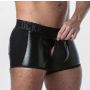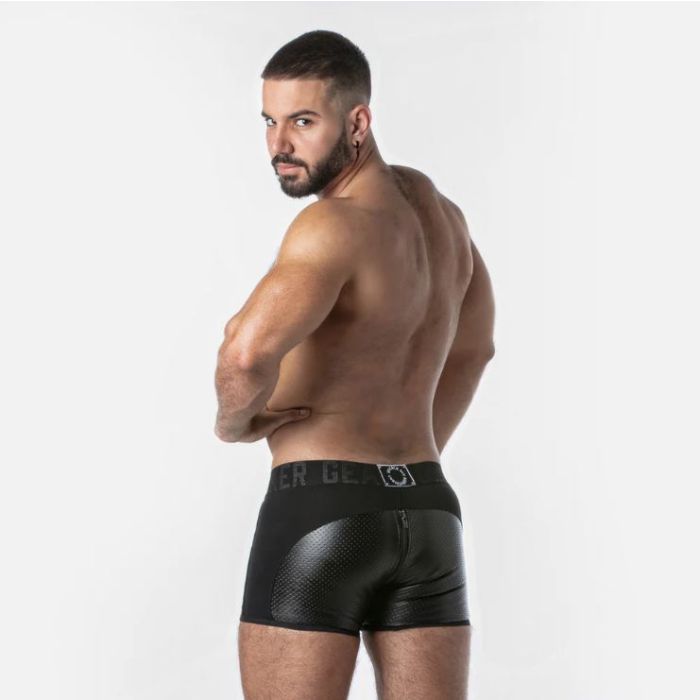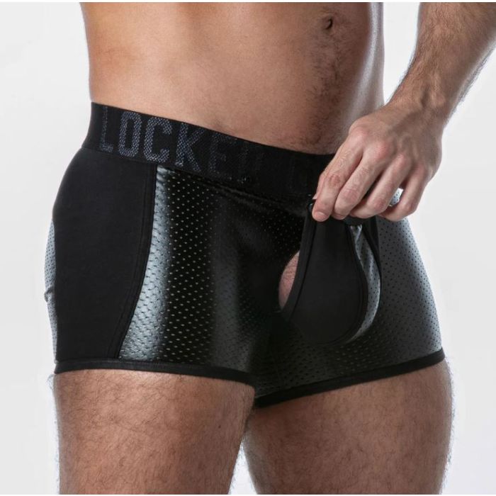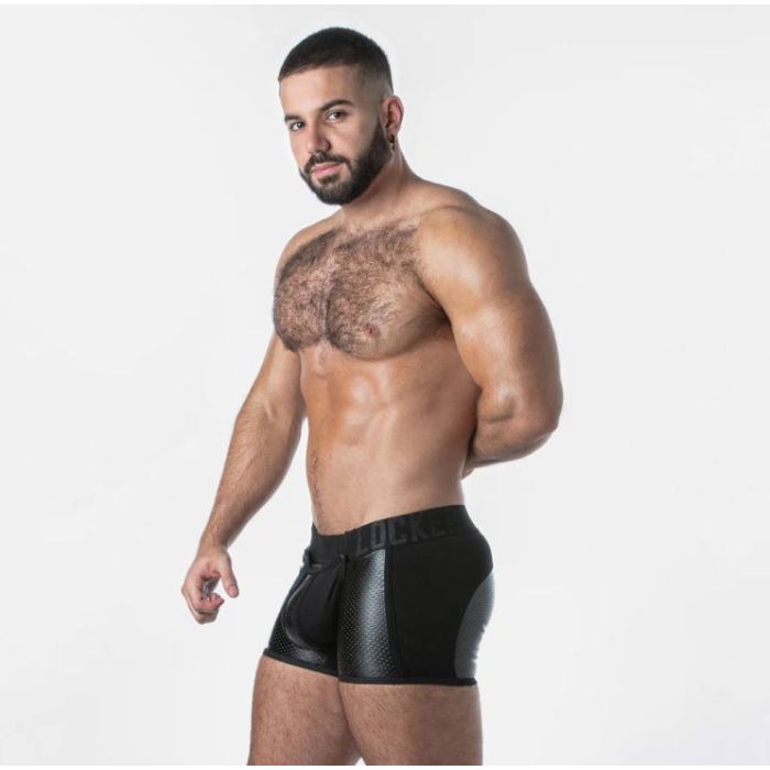 Deze vierkante snit trunk, vervaardigd uit de meest verfijnde geperforeerde kunstleer, is een opvallend kledingstuk van het gay merk Locker Gear. Het gebruik van hoogwaardig materiaal zorgt niet alleen voor een luxe uitstraling, maar ook voor een comfortabele pasvorm die de contouren van het lichaam accentueert. De contrasterende details voegen een extra dimensie toe aan het ontwerp, waardoor deze trunk niet alleen functioneel is, maar ook een modieuze keuze voor de zelfbewuste man.